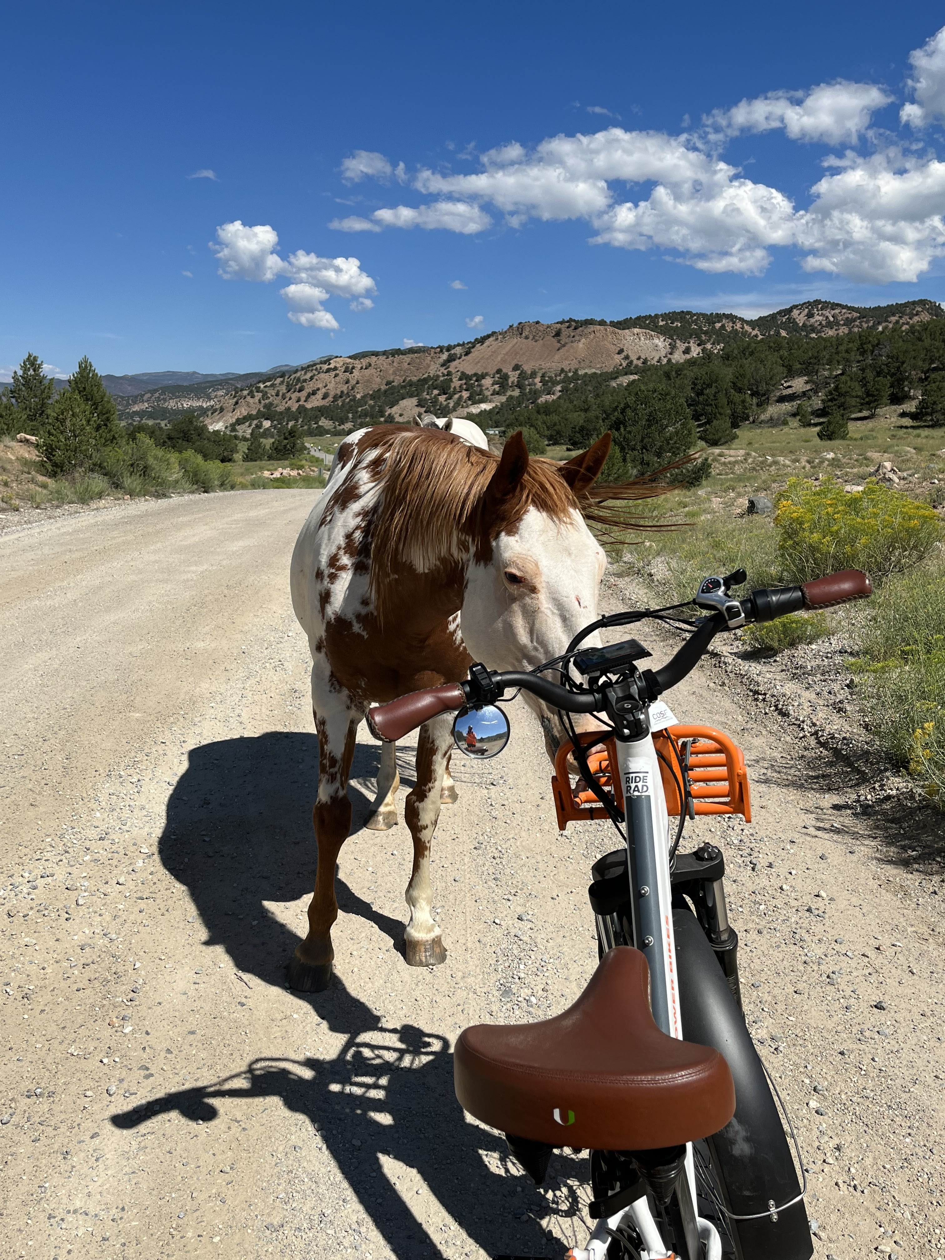 We continued on for another couple of miles till we hit the spot where you can launch a raft, and cross Hwy 50 if you want. We didn’t want… We turned around and pedaled back. Some horses were wandering and were intrigued by the bike. One by one, they smelled my bike then let me pet them! How sweet! On we went…